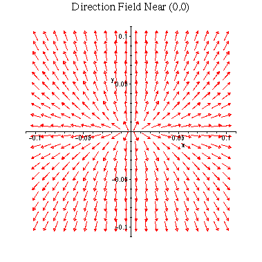 > DEplot( MODEL, VARS, DOMAIN, RANGE1, arrows=MEDIUM, title=`Direction Field Near (0,0)` );